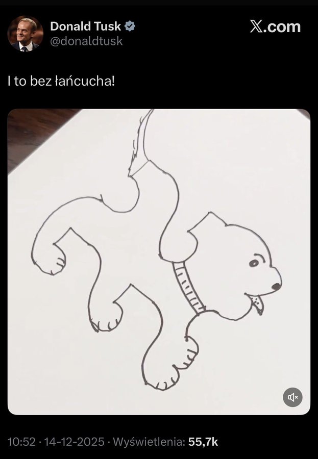 Ostatnio premier zamieścił na X “przezabawny” filmik, jak przerabia cyfry 5 w rysunek “pieska” z dumą dodając, że piesek jest bez łańcucha. Piesek wygląda cokolwiek dziwacznie, więc stał się obiektem analiz internautów. Warto więc wspomnieć, że pan premier nie jest pierwszy. W 2013 roku podobnym talentem popisał się Władimir Władimirowicz Putin, który na interaktywnej tablicy palcem narysował dzieciom kotkę – widok z tyłu, jak sam objaśnił swoje dzieło, wyglądające jeszcze bardziej, hmmm – dziwacznie niż piesek Tuska. Tu warto dodać, że chociaż wtedy “Putin demokratą był”, pojawiły się głosy próbujące dociec, że przywódca Rosji nie ma aby problemów w pewnej delikatnej sferze życia. Filmik z Putinem rysującym korka zniknął z interentu, ale sam rysunek można jeszcze znaleźć (choć w słabej rozdzielczości).